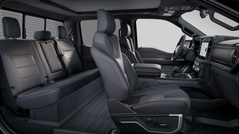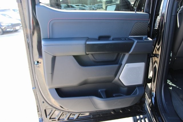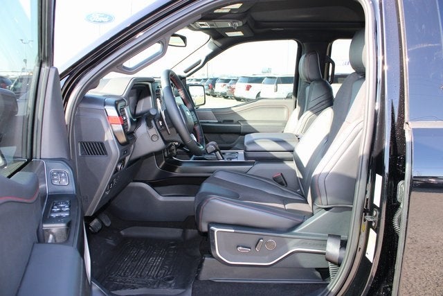 Agate Black Metallic 2025 Ford F-150 Raptor EQUIPPED WITH Equipment Group 802A Raptor 37 (Carbon Fiber Interior Appliques, Dual Valve Shocks, Modular Front Bumper, RECARO Alcantara Suede Front Seats, and Wheels: Raptor 37 Unique 17 Cast Aluminum), 4WD, 14 Speakers, 17 Cast Aluminum Wheels, 4-Wheel Disc Brakes, ABS brakes, Adjustable pedals, Air Conditioning, Alloy wheels, AM/FM radio: SiriusXM with 360L, Auto High-beam Headlights, Auto tilt-away steering wheel, Auto-dimming door mirrors, Auto-dimming Rear-View mirror, Automatic temperature control, Brake assist, Bumpers: body-color, Compass, Delay-off headlights, Driver door bin, Driver vanity mirror, Dual front impact airbags, Dual front side impact airbags, Electronic Locking w/4.10 Axle Ratio, Electronic Stability Control, Emergency communication system: SYNC 4 911 Assist, Front anti-roll bar, Front Bucket Seats, Front Center Armrest, Front dual zone A/C, Front fog lights, Front License Plate Bracket, Front reading lights, Front wheel independent suspension, Fully automatic headlights, Garage door transmitter, Heads-Up Display, Heated door mirrors, Heated front seats, Heated rear seats, Heated steering wheel, Illuminated entry, Lane Departure Warning System, Leather steering wheel, Leather Trimmed Seats, Low tire pressure warning, Memory seat, Navigation system: Connected Navigation, Occupant sensing airbag, Outside temperature display, Overhead airbag, Overhead console, Panic alarm, Passenger door bin, Passenger vanity mirror, Pedal memory, Power door mirrors, Power driver seat, Power passenger seat, Power steering, Power windows, Radio data system, Radio: B&O Unleashed Sound System by Bang & Olufsen, Rain sensing wipers, Rear reading lights, Rear step bumper, Rear window defroster, Remote keyless entry, Security system, Speed control, Speed-sensing steering, Split folding rear seat, Steering wheel memory, Steering wheel mounted audio controls, SYNC 4 w/Enhanced Voice Recognition, Tachometer, Telescoping steering wheel, Tilt steering wheel, Tough Bed Spray-In Bedliner, Traction control, Trip computer, Turn signal indicator mirrors, Twin Panel Moonroof, Variably intermittent wipers, and Ventilated front seats.