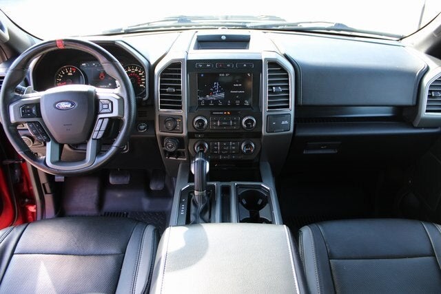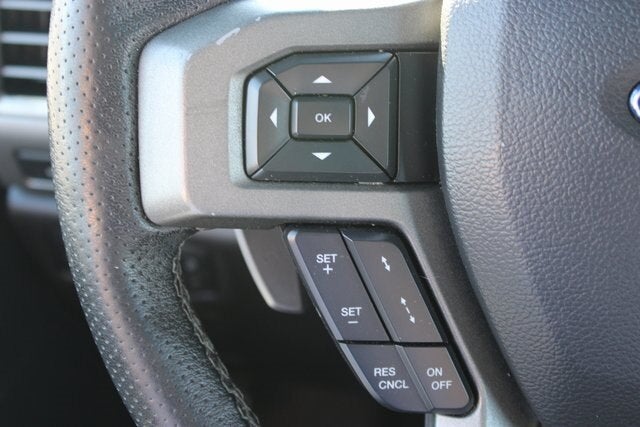 EQUIPPED WITH Equipment Group 802A Luxury (10-Way Power Driver & Passenger Seats, 360 Degree Camera, 4.10 Front Axle w/Torsen Differential, 8 Productivity Screen, Advanced Security Pack, Ambient Lighting - Ice Blue Color Only, BLIS Blind Spot Information System, Dual-Zone Electronic Automatic Temperature Control, Heated Steering Wheel, Inflatable Rear Safety Belts, Integrated Trailer Brake Controller, Intelligent Access w/Push-Button Start, LED Box Lighting, LED Sideview Mirror Spotlights, Memory System (Seat, Pedal, Exterior Mirror), Power Glass Heated Sideview Mirrors, Power Tilt/Telescoping Steering Column w/Memory, Power-Adjustable Pedals, Power-Sliding Rear Window, Pro Trailer Backup Assist, Radio: B&O Play Premium Audio System, Remote Start System w/Remote Tailgate Release, SYNC 3, SYNC Connect, Tailgate Applique FORD, Universal Garage Door Opener, and Voice-Activated Touchscreen Navigation System), GVWR: 7,050 lbs Payload Package, Raptor Exterior Graphics Package, Raptor Hood Graphics Package, Raptor Technology Package (Adaptive Cruise Control w/Collision Mitigation, Auto High Beam, and Lane-Keeping System), 4WD, 17 Cast Aluminum Wheels, 17 Forged Aluminum Bead-Lock Capable Wheels, 4-Wheel Disc Brakes, 7 Speakers, 8-Way Power Driver's Seat w/Power Lumbar, ABS brakes, Air Conditioning, Alloy wheels, AM/FM radio: SiriusXM, Auto-dimming Rear-View mirror, Brake assist, CD player, Compass, Delay-off headlights, Driver door bin, Driver vanity mirror, Dual front impact airbags, Dual front side impact airbags, Electronic Locking w/4.10 Axle Ratio, Electronic Stability Control, Emergency communication system: 911 Assist, Exterior Parking Camera Rear, Front anti-roll bar, Front Bucket Seats, Front Center Armrest, Front fog lights, Front reading lights, Front wheel independent suspension, Fully automatic headlights, Heated Leather 40/Console/40 Front Seats, Illuminated entry, Leather steering wheel, Low tire pressure warning, Occupant sensing airbag, Outside temperature display, Overhead airbag, Overhead console, Panic alarm, Passenger door bin, Passenger vanity mirror, Power door mirrors, Power driver seat, Power steering, Power windows, Radio data system, Rear Parking Sensors, Rear reading lights, Rear step bumper, Rear window defroster, Remote keyless entry, Security system, Speed control, Speed-sensing steering, Split folding rear seat, Spray-In Bedliner (Pre-Installed), Steering wheel mounted audio controls, SYNC, Tachometer, Tailgate Step w/Tailgate Lift Assist, Telescoping steering wheel, Tilt steering wheel, Traction control, Trip computer, Twin Panel Moonroof, Unique Cloth Trim Seats, and Variably intermittent wipers.