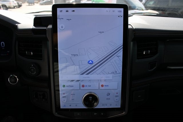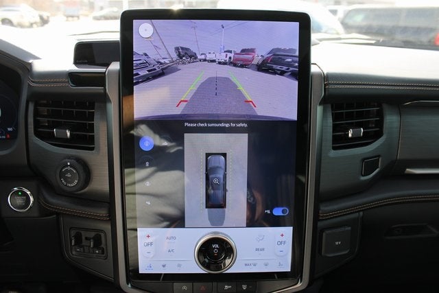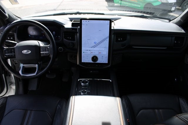 EQUIPPED WITH Equipment Group 600A Standard Package, Heavy-Duty Trailer Tow Package (26mm Engine Radiator, 3.73 Axle Ratio, 360-Degree Camera w/Trailer Reverse Guidance, Front Tow Hooks, Integrated Trailer Brake Controller, and Pro Trailer Backup Assist), Continuous Controlled Damping (CCD), Navigation system: Connected Navigation, Wheels: 22 6-Spoke Polished Aluminum, 22 Speakers, 3rd row seats: split-bench, 4-Wheel Disc Brakes, ABS brakes, Adaptive suspension, Adjustable pedals, Air Conditioning, Alloy wheels, AM/FM radio: SiriusXM with 360L, Auto High-beam Headlights, Auto-dimming door mirrors, Auto-dimming Rear-View mirror, Automatic temperature control, Brake assist, Bumpers: body-color, Compass, Delay-off headlights, Driver door bin, Driver vanity mirror, Dual front impact airbags, Dual front side impact airbags, Electronic Stability Control, Emergency communication system: SYNC 4 911 Assist, Exterior Parking Camera Rear, Four wheel independent suspension, Front anti-roll bar, Front Bucket Seats, Front Center Armrest, Front dual zone A/C, Front fog lights, Front reading lights, Fully automatic headlights, Garage door transmitter, Genuine wood console insert, Genuine wood dashboard insert, Genuine wood door panel insert, Heated door mirrors, Heated front seats, Heated rear seats, Heated steering wheel, Heated/Ventilated Prem Lthr Front Captain's Chairs, Illuminated entry, Leather steering wheel, Low tire pressure warning, Memory seat, Occupant sensing airbag, Outside temperature display, Overhead airbag, Overhead console, Panic alarm, Passenger door bin, Passenger vanity mirror, Pedal memory, Power door mirrors, Power driver seat, Power Liftgate, Power moonroof, Power passenger seat, Power steering, Power windows, Radio data system, Radio: B&O Unleashed Sound System by Bang & Olufsen, Rain sensing wipers, Rear air conditioning, Rear anti-roll bar, Rear audio controls, Rear reading lights, Rear window defroster, Rear window wiper, Reclining 3rd row seat, Remote keyless entry, Security system, SiriusXM w/360L, Speed control, Speed-sensing steering, Speed-Sensitive Wipers, Split folding rear seat, Spoiler, Steering wheel memory, Steering wheel mounted audio controls, SYNC 4 w/Enhanced Voice Recognition, Tachometer, Telescoping steering wheel, Tilt steering wheel, Traction control, Trip computer, Turn signal indicator mirrors, Variably intermittent wipers, Ventilated front seats, and Voltmeter.